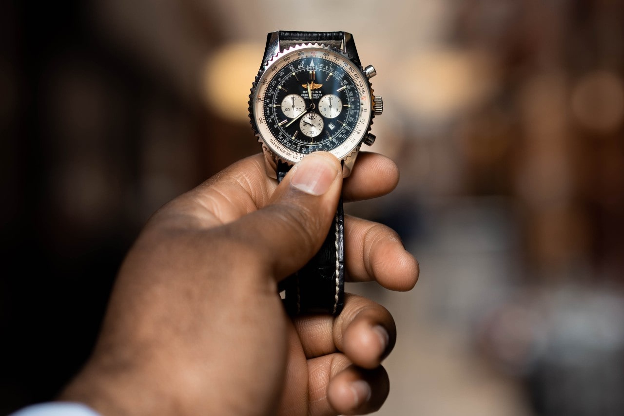 A man holds up his favorite Breitling timepiece to check the time at a dinner partyA man holds up his favorite Breitling timepiece to check the time at a dinner partyA man holds up his favorite Breitling timepiece to check the time at a dinner party
