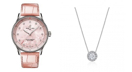 Embracing a feminine, glittering aesthetic has never been more enchanting than layering a pink watch, adorned with diamonds, with a diamond pendant necklace. The soft pink hues of this Breitling watch, combined with its radiant diamond embellishments, set a distinctly elegant and feminine tone. Complementing it with a diamond pendant necklace like this one from TACORI enhances this aesthetic, introducing a layer of eclectic sophistication. Each piece plays up the beauty of the other, where the softness of the pink is elevated by the sparkle of the diamonds, creating a cohesive look that's both luxurious and playful. This pairing not only amplifies the individual charm of each accessory, but also crafts a striking statement of style, showcasing an impeccable blend of color, texture, and brilliance that's truly captivating.